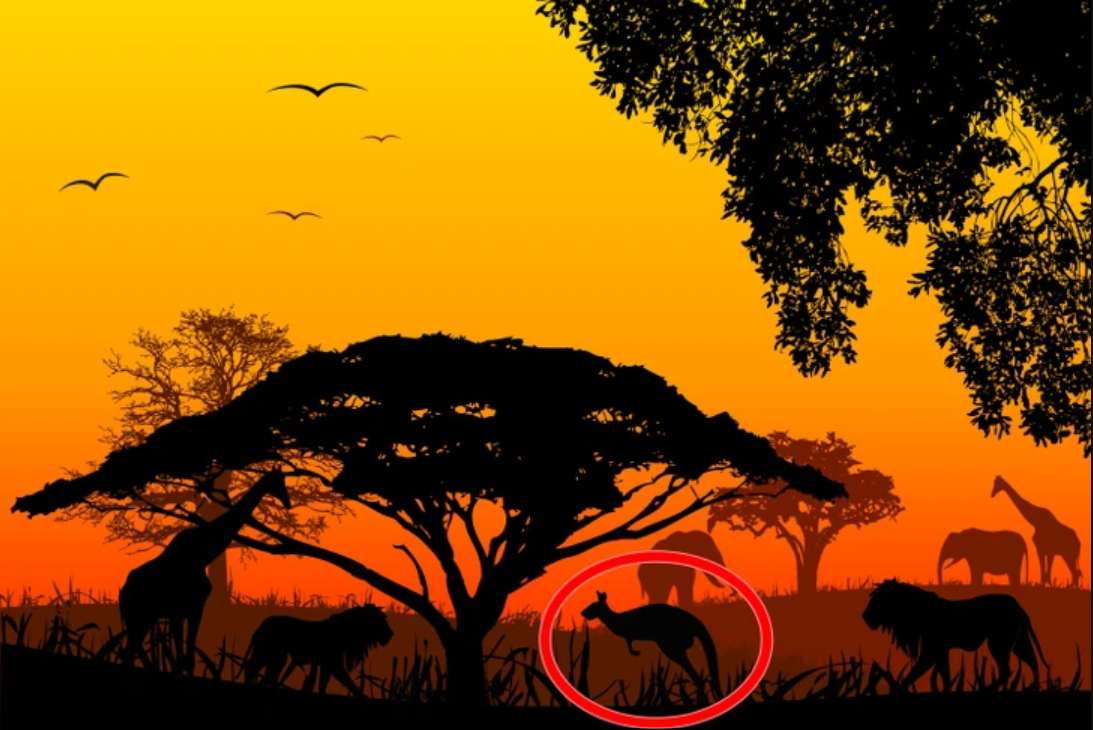 In the image above, you can see an African savannah. You can also see different animals going on about their day in the picture. There are kangaroos, giraffes, lions, and elephants in this picture puzzle. Now, there is a significant mistake in this brain teaser puzzle. There is something here that does not belong in the picture. Can you find out what it is? We have the utmost faith in you and your skills. The time limit that we have set for this brain teaser puzzle is 6 seconds. So, set your timers and get started. All the best, folks.