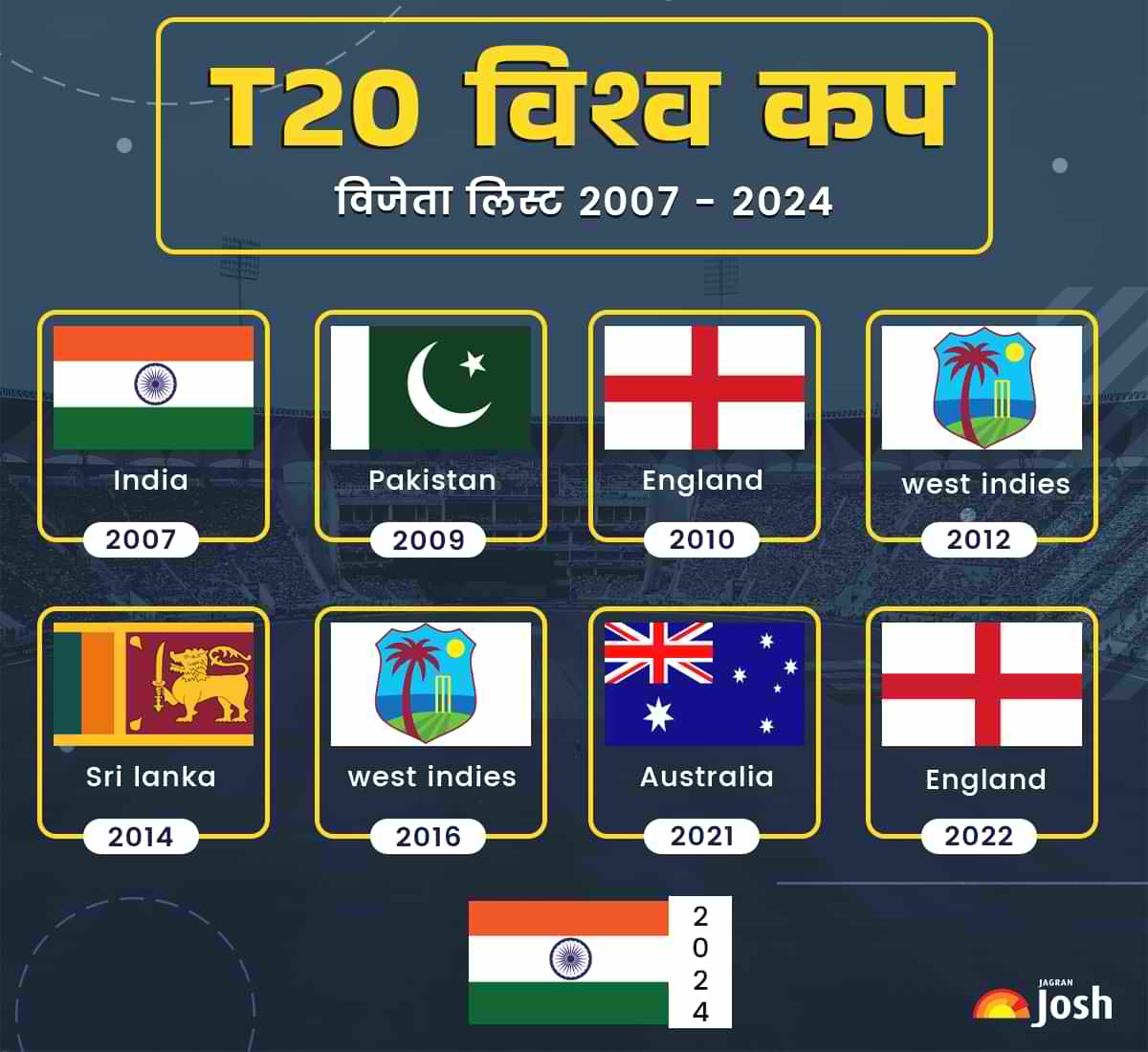 टी20 विश्व कप का ख़िताब इंग्लैंड, भारत और वेस्टइंडीज ने दो-दो बार जीता है, वहीं पाकिस्तान, श्रीलंका और ऑस्ट्रेलिया ने यह ख़िताब एक-एक बार जीता है. साल 2024 की बात करें तो भारत ने इतिहास रच दिया है.