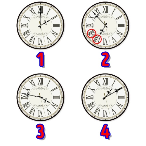 So, all you are excited to know is, among these four clocks, which one is the odd clock? Okey, so, look at clock number 2. There is not a given VII or 35 minutes on the clock.