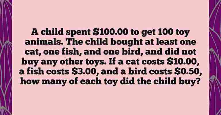 A child spent $100.00 to get 100 toy animals. The child bought at least one cat, one fish, and one bird, and did not buy any other toys. If a cat costs $10.00, a fish costs $3.00, and a bird costs $0.50, how many of each toy did the child buy?
