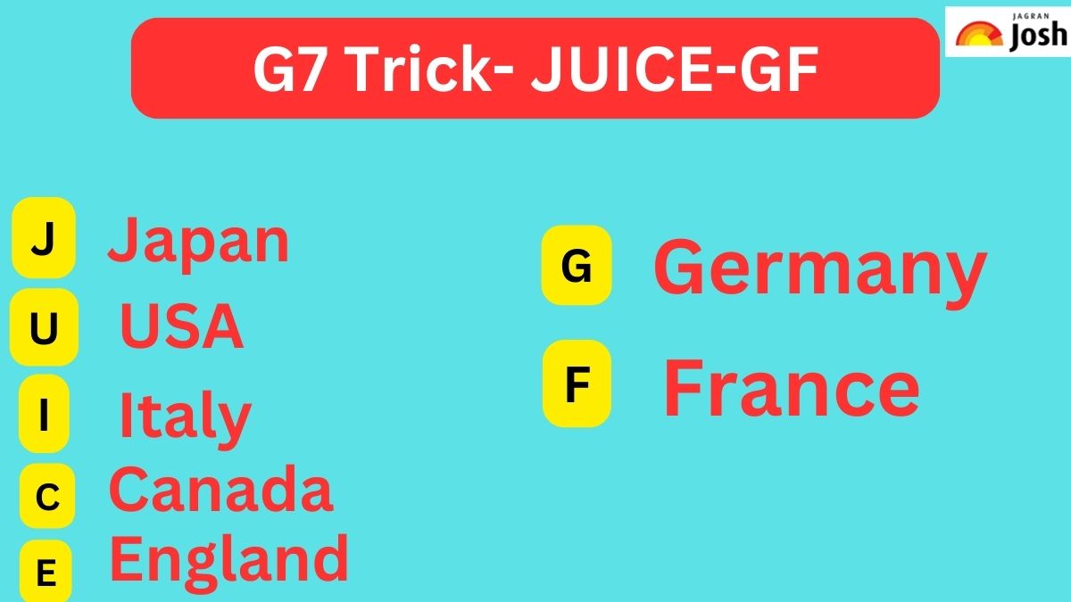 अब सवाल है कि आखिर किस आसान ट्रिक से इन देशों का नाम याद रख सकते हैं, तो आपको बता दें कि JUICE-GF इसकी एक आसान ट्रिक है, जिसके माध्यम से इन देशों के नामों को याद किया जा सकता है। यहां पर J-जापान,U-यूएसए,I-इटली,C-कनाडा,E-इंग्लैंड,G-जर्मनी और F-फ्रांंस से देशों के नाम को याद किया जा सकता है।