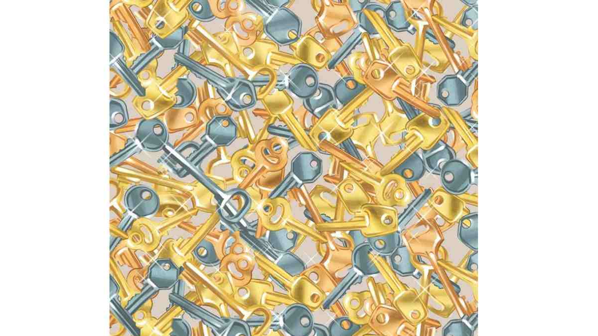 The image shows a non-uniformly divided bunch of gold and silver keys. And your task is to find the bell hidden in the picture. Divide the image into rows and columns. Now go through all of the corners to not miss any clues and use your skills like logical reasoning, observational power, and other abilities to conclude this mental exercise.