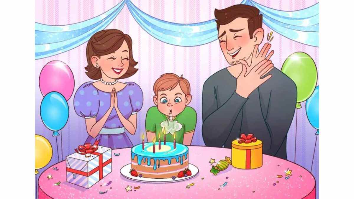 The picture shows a couple celebrating their son's 5th birthday. And your task is to find the hidden mistakes in the picture. Now divide the image into sections, go through all the rows and sections and use your skills like logical reasoning, observational power, and other abilities to conclude this mental exercise.