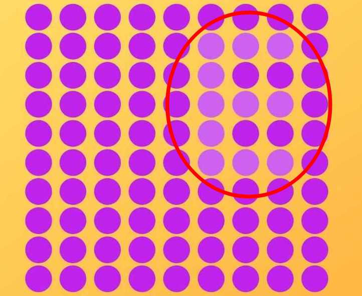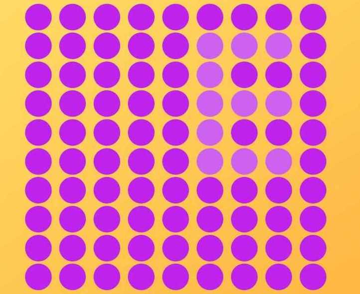 In this visual illusion picture, a grid of purple-coloured circles can be seen. Hiding within the grid is a letter.