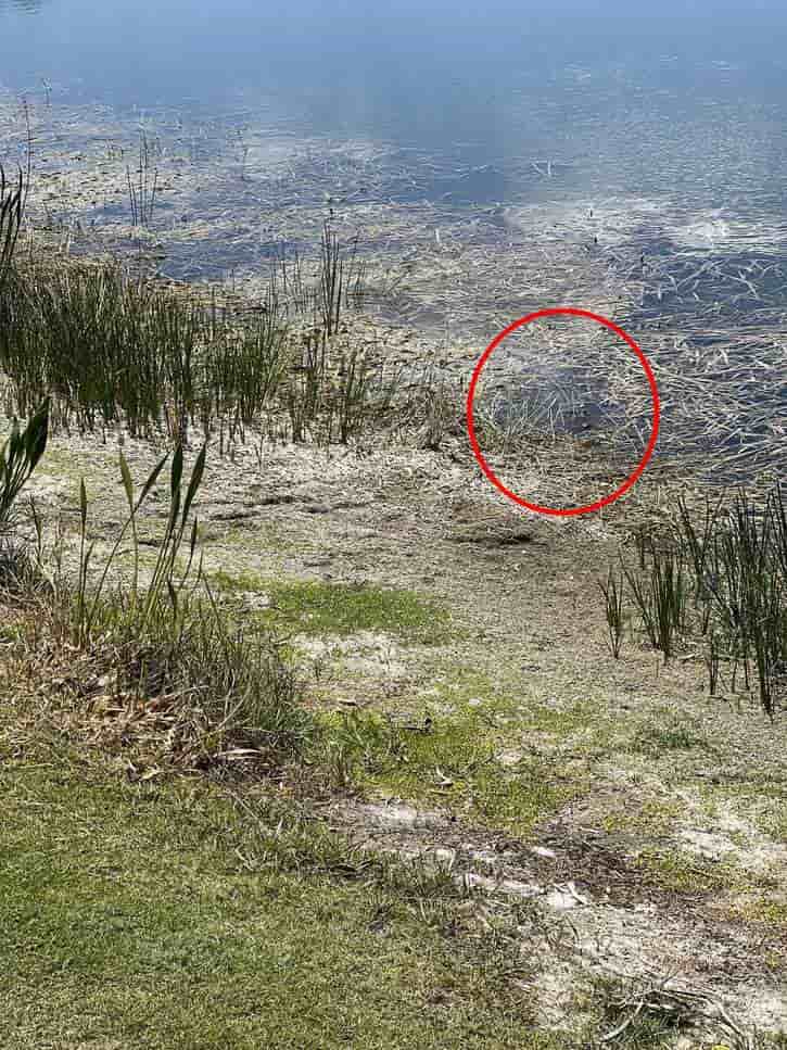 In this visual illusion picture, a lake scene is shared. Hidden in plain sight in the water is an alligator.