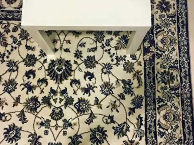 In this visual illusion picture, an off-white coloured table and a carpet of contrasting colour can be seen. There is a mobile phone hidden somewhere in the picture.
