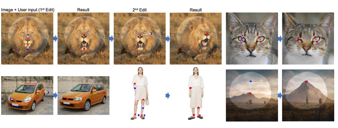 The research paper mentions “Through DragGAN, anyone can deform an image with precise control over where pixels go, thus manipulating the pose, shape, expression, and layout of diverse categories such as animals, cars, humans, landscapes, etc.