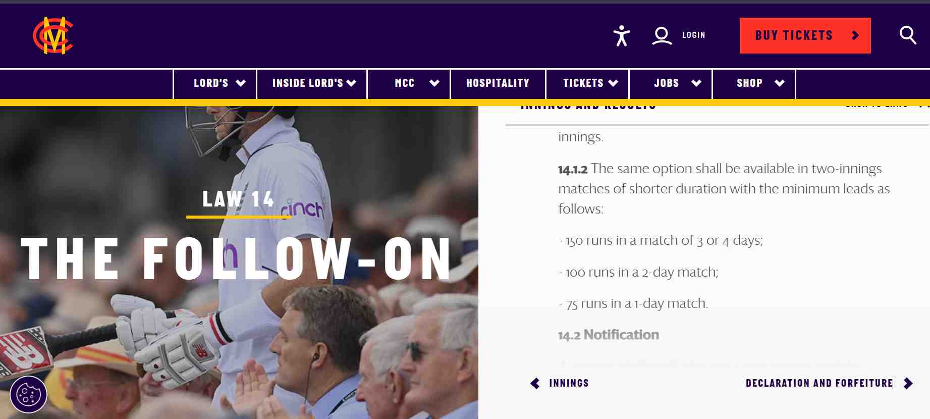 - In shorter matches (3 or 4 days), the lead must be 150 runs.