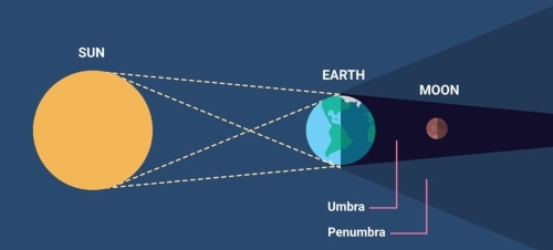 A lunar eclipse, a "Blood Moon" due to its reddish-orange appearance, takes place when the Earth comes between the Sun and the Moon, causing the Earth's shadow to fall on the Moon. A total lunar eclipse occurs when the Moon is completely enveloped by the Earth's umbra, which is the darkest part of its shadow.