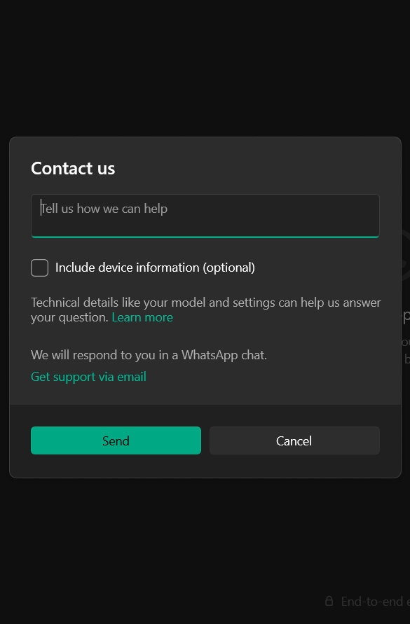 In the chat window, users can describe their issue and the WhatsApp Support team will then respond to the chat and try to resolve the issue. However, the issue can be resolved over email if the user doesn’t want an answer right within the chat.