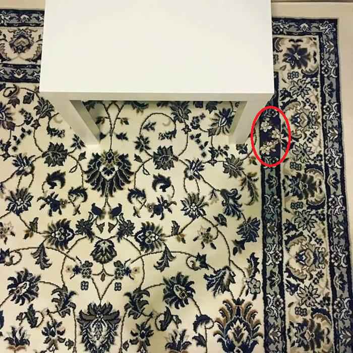 In this viral optical illusion image shared by the Filipino lady Jeya May Cruz, you can see a beautiful floral pattern rug and a small white table adorning the floor.