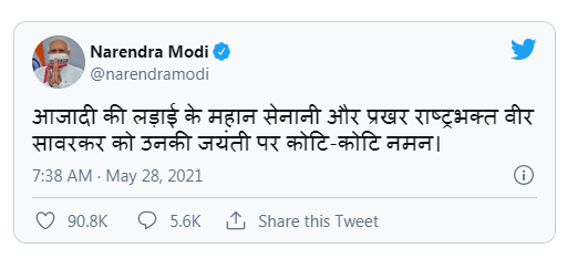 Veer Savarkar was born on 28 May, 1883 in the village Bhagpur, Nashik and died on 26 February, 1966, Bombay (now Mumbai). His full name is Vinayak Damodar Savarkar. He was a freedom fighter, politician, lawyer, social reformer, and formulator of the philosophy of Hindutva. PM Narendra Modi paid tributes to the great freedom fighter and patriot Veer Savarkar on his birth anniversary. He tweeted