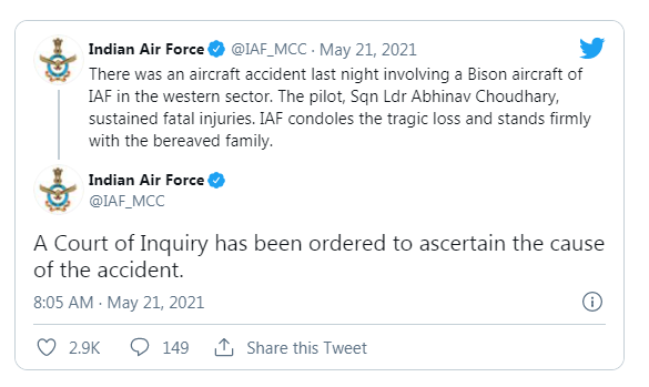 भारतीय वायुसेना ने दुखद नुकसान पर शोक व्यक्त करने के लिए ट्विटर का सहारा लिया और कहा कि दुर्घटना के कारणों का पता लगाने के लिए कोर्ट ऑफ इंक्वायरी का आदेश दिया गया है.