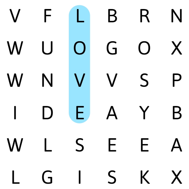 The word love can be spotted appearing on the third column arranged downwards in a sequence.