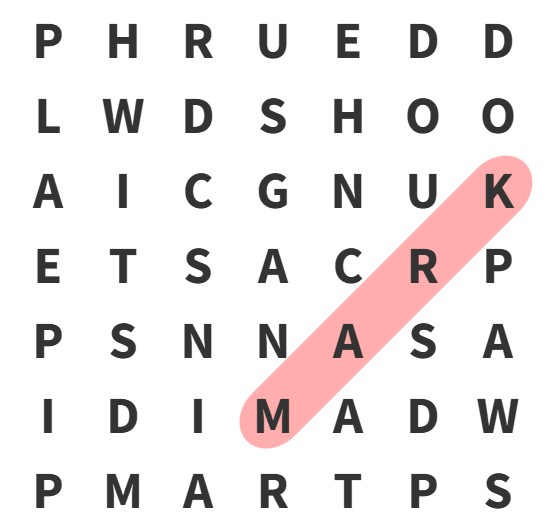 The word "MARK" can be spotted in a diagonal sequence starting from the fourth column.