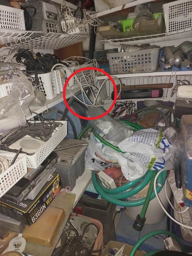 The presence of so many wires and drawers full of old accessories and equipment makes it difficult to spot the cat at first glance.