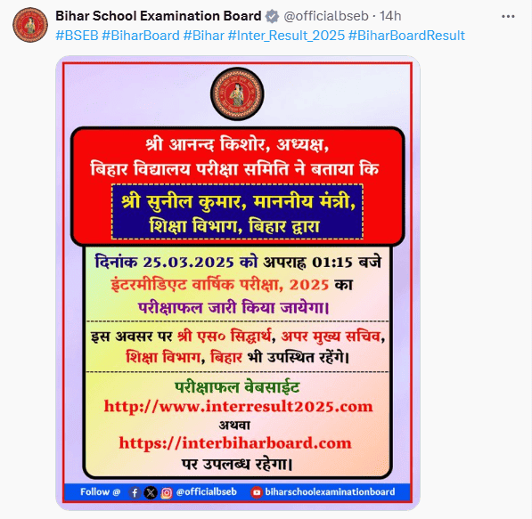 | Bihar Board Inter Result 2025: Official Tweet about upcoming BSEB 12th result Candidates can check the exam dates mentioned below for the class 12th Bihar Board examination 2025: