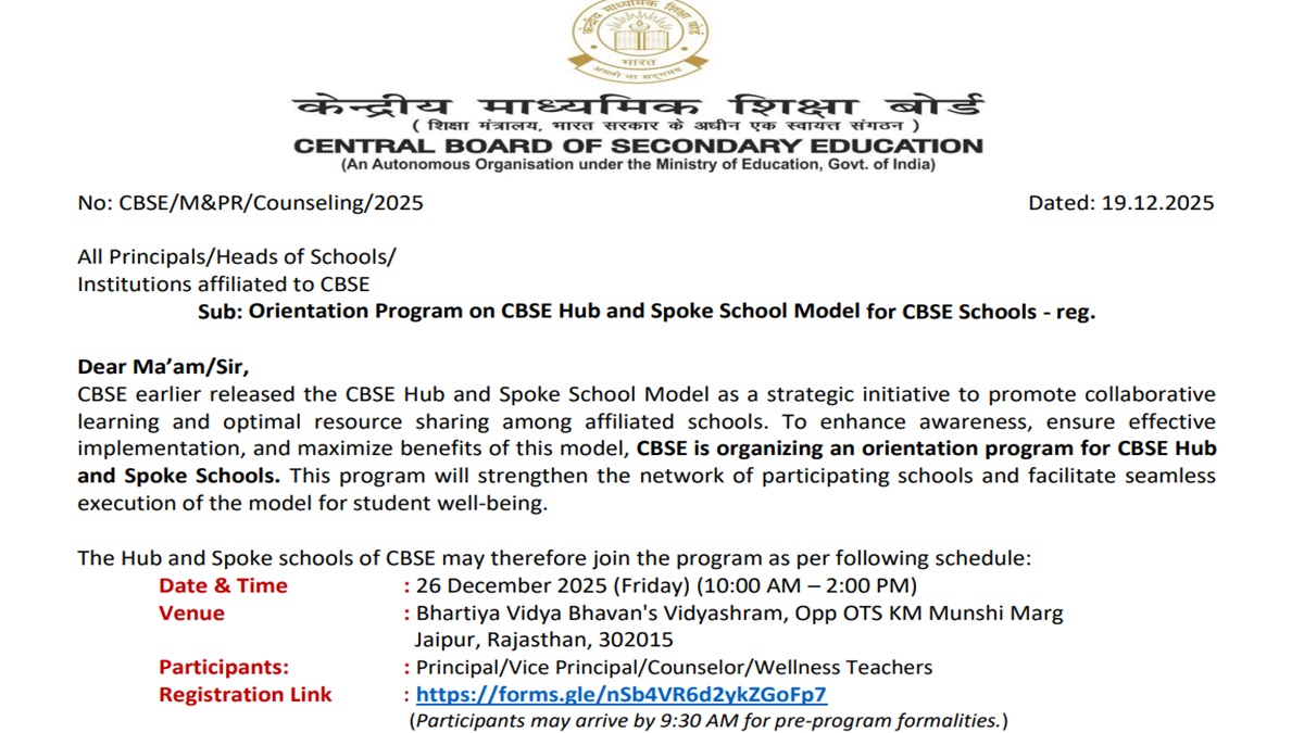 CBSE will be conducting the orientation programme on December 26, 2025, from 10 am to 2 pm at the Bhartiya Vidya Bhavan Vidyashram, Jaipur. Those participating in the programme must report to the venue by 9:30 am to complete the pre-programme formalities.