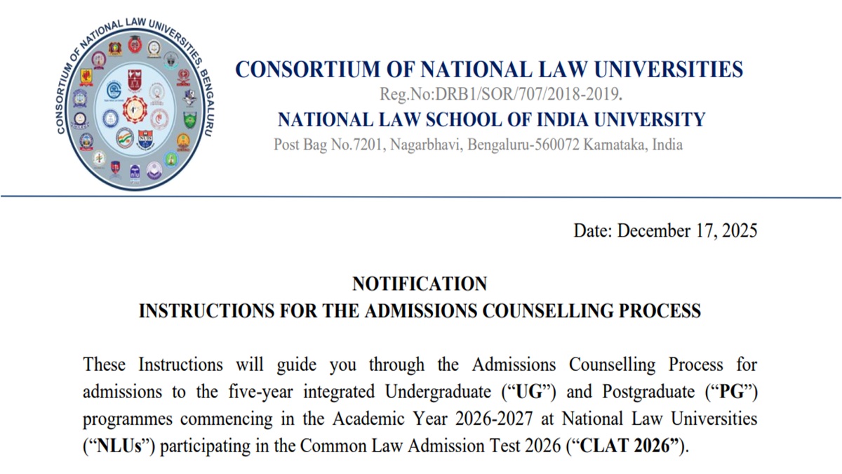 - CLAT 2026 counselling registration window opens at consortiumofnlus.ac.in