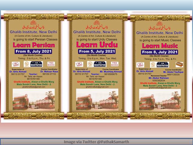 Ghalib Institute will launch its first free online course titled ‘Learn Urdu’ from 5th July 2021. The six-monthly course will be offered with 3 classes per week to be held on Monday, Tuesday and Wednesday. The class duration will be of 1 hour each from 5 PM to 6 PM in the evening. Similarly, Learn Persian course will be held from 8th July 2021 and the total course duration will be of 6 months. Classes for Learn Persian course would be held twice a week on Thursday and Friday. The class duration will be of 1 hour each from 5 PM to 6 PM in the evening.