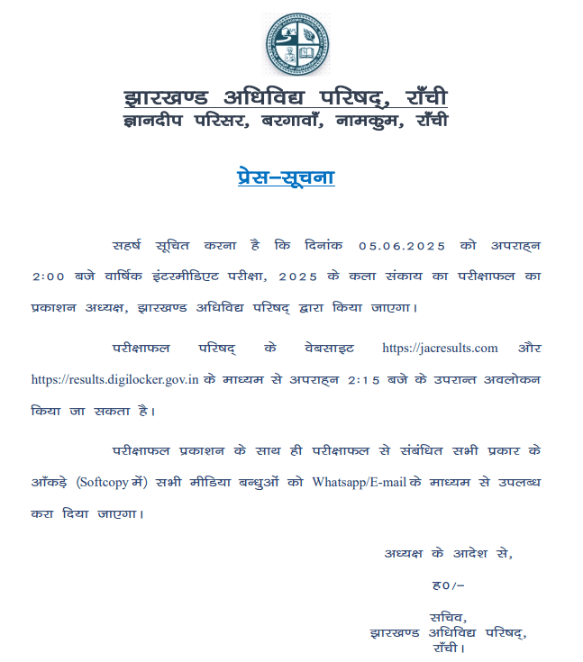 According to the official notice by the Jharkhand Board, the JAC 12th Result for arts stream were released on the official website at jacresults.com, results.digilocker.gov.in, and jagranjosh.com/results on June 5, 2025 at 2 PM. Students can find the official notice here.