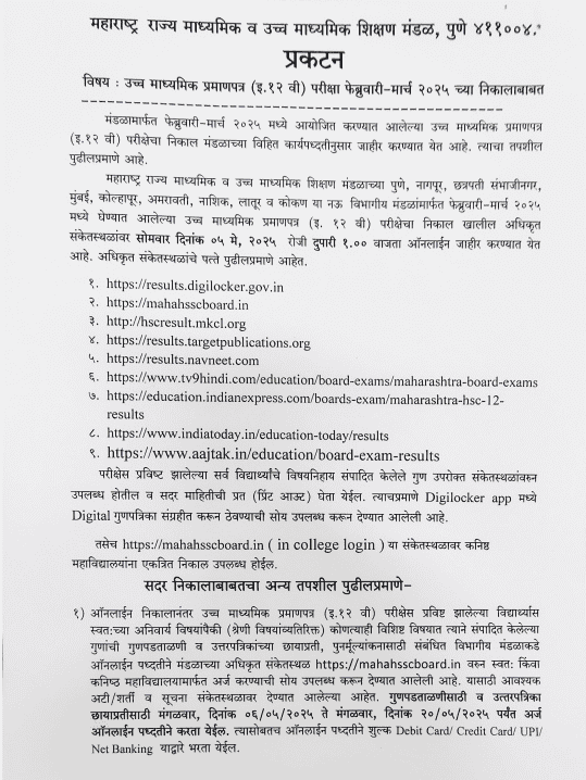 | HSC Class 12th Results Date | 2025 | May 5, 2025 at 1 PM |