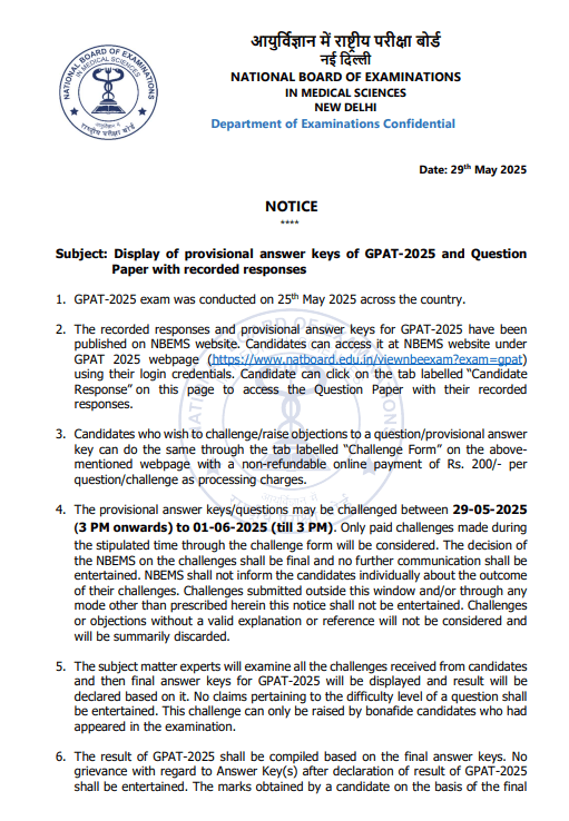 GPAT 2025 Answer Key: The National Board of Examinations in Medical Sciences (NBEMS) has released the provisional answer key for the Graduate Pharmacy Aptitude Test (GPAT) 2025 today, May 29, 2025. The answer keys are available to download on the official website at natboard.edu.in. The last date to raise any objections is June 1, 2025 till 3 PM.