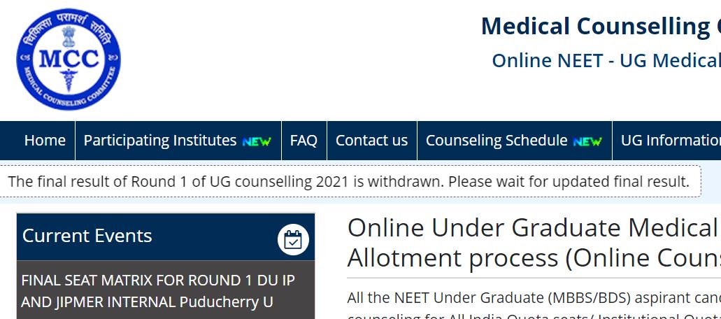 NEET UG 2021: As per the recent updates, the Medical Counselling Committee has withdrawn the final result of round 1 of the National Eligibility cum Entrance Test (NEET) UG counselling 2021 today without stating any reason. “The final result of Round 1 of UG counselling 2021 is withdrawn. Please wait for the updated final result,” said a kicker on the official website.