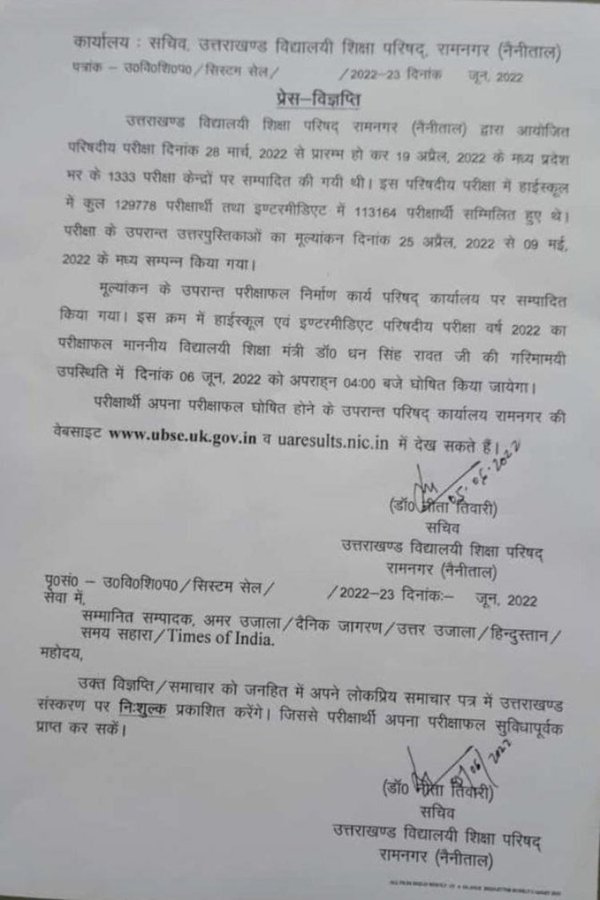 UK Board 10th, 12th Result 2022 Today: 6th June will turn out to be a good day for students awaiting their UK Board 10th Result 2022 and UK Board 12th Result 2022. As per the formal notice issued by UBSE - Uttarakhand Board of School Education, the UK Board Result 2022 for High School and Intermediate Class students will be declared today evening at 4 PM. Media reports coming from the Nainital Office of UBSE suggests that the Uttarakhand Board has organized a brief press meet cum declaration ceremony in which the UK Board Result 2022 will be declared first by the officials. Thereafter, UBSE 10th, 12th Results 2022 will be made available to the students online via the official websites - uaresults.nic.in and ubse.uk.gov.in. Alternatively, students will also be able to check and download UBSE Class 10 and 12 Results online via the direct links placed below: