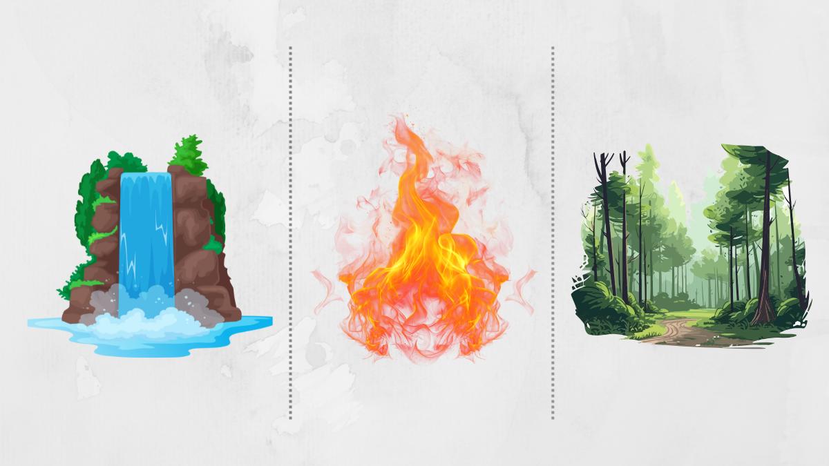 You have three elements before you in the image above: Water, Fire, and Nature. Each holds a particular type of energy and substance.