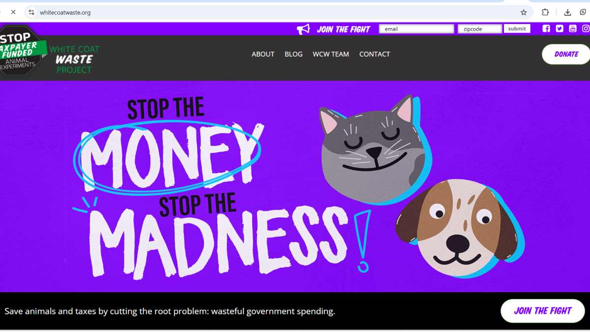 The White Coat Waste Project (WCW) is an innovative, bipartisan watchdog organization that is fighting to end taxpayer-funded animal experiments in U.S. government labs. It is operated as a 501(c)(3) nonprofit project. WCW’s mission is clear and straightforward, which states, “Stop the Money. Stop the Madness.” Their continuous effort focuses mainly on cutting off the federal funding, of over $20 billion annually, that fuels cruel and unnecessary animal testing.