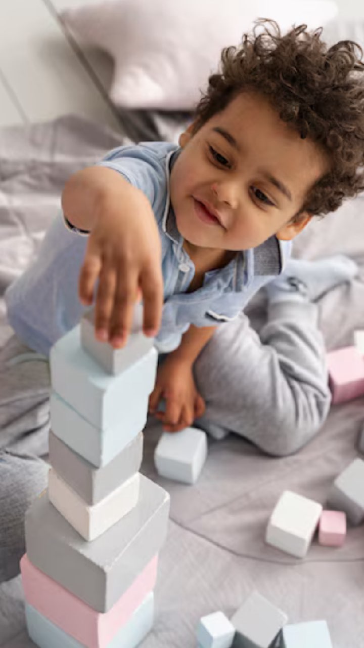 Improves hand-eye coordination and dexterity. Handling blocks strengthens small muscle movements.