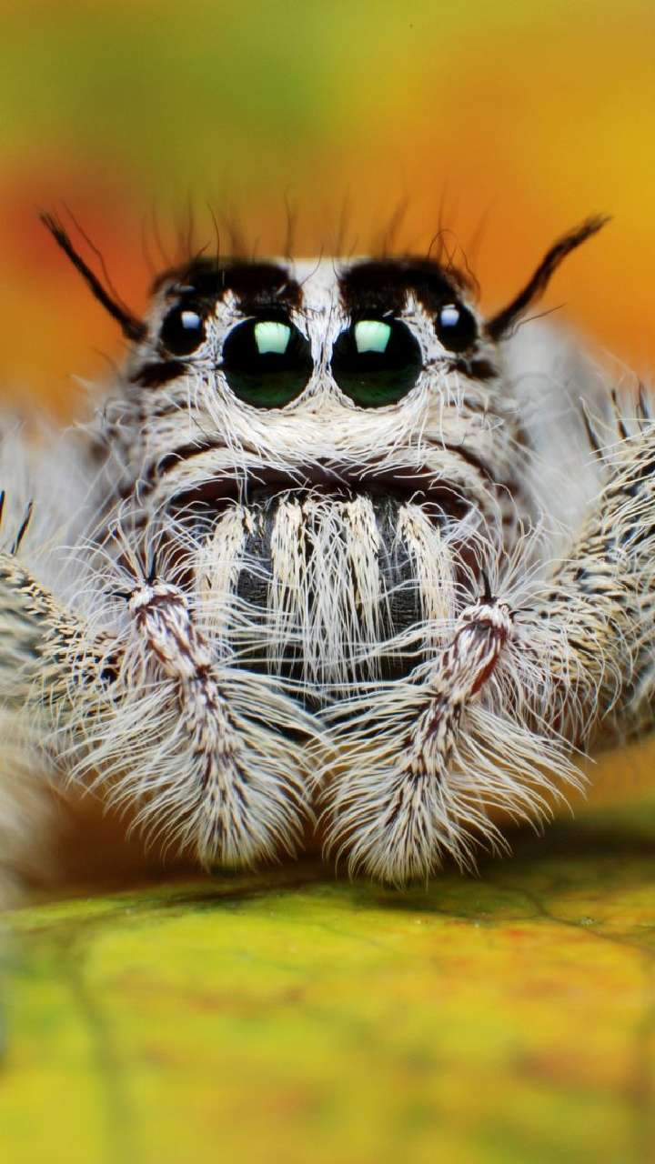 ज्यादातर मकड़ियों की लगभग आठ आंखें और फिर नीचे छोटी आंखें, पंक्तियों में। उनकी आंखें उन्हें हरकत और रोशनी में होने वाले बदलावों को पहचानने में मदद करती हैं।