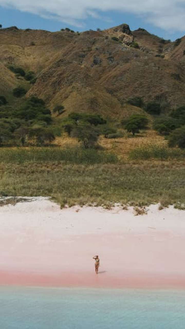 The sand looks pink because of crushed coral and tiny marine creatures. It’s a rare and beautiful sight in the Bahamas.