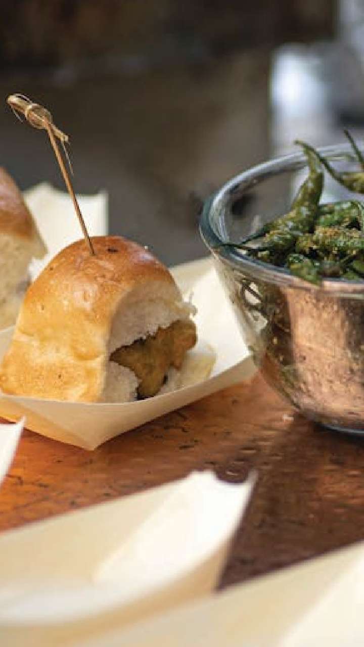 Known as the Indian burger, Vada Pav is a deep-fried potato patty stuffed in a bread roll, served with spicy chutney and fried green chilies.