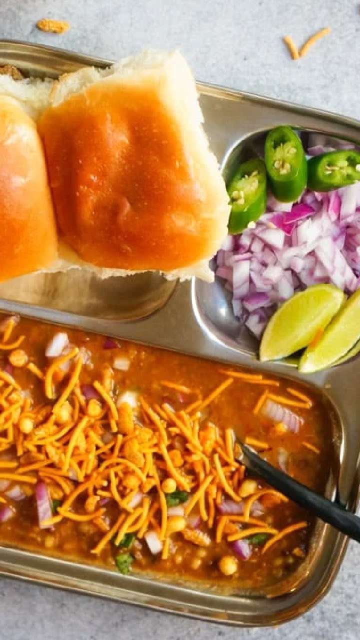 A spicy and tangy curry made from sprouted beans, topped with crunchy farsan and served with pav. It’s a popular breakfast or snack dish.