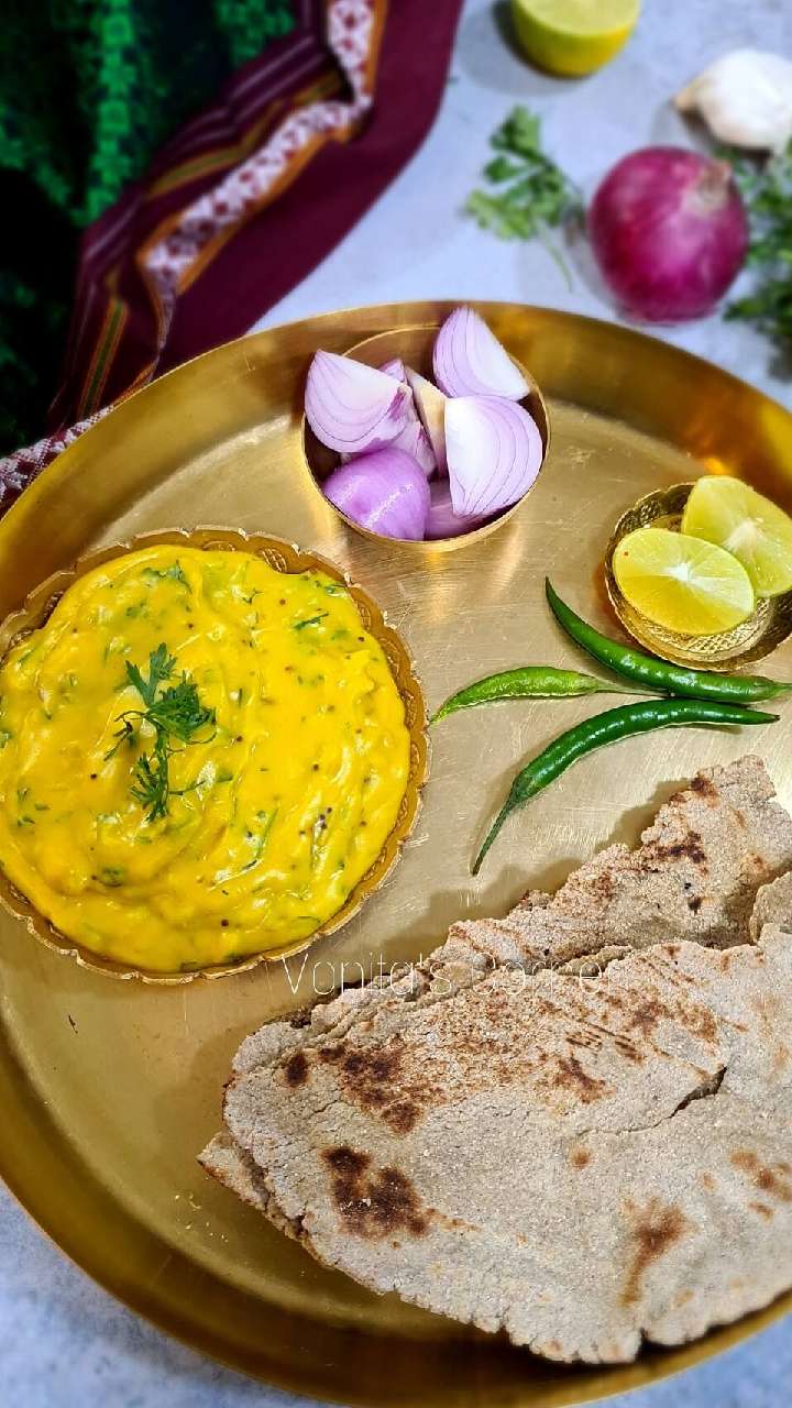Bhakri is a type of flatbread made from jowar or bajra, usually served with a spicy green chili paste called thecha, a rural Maharashtrian delicacy.