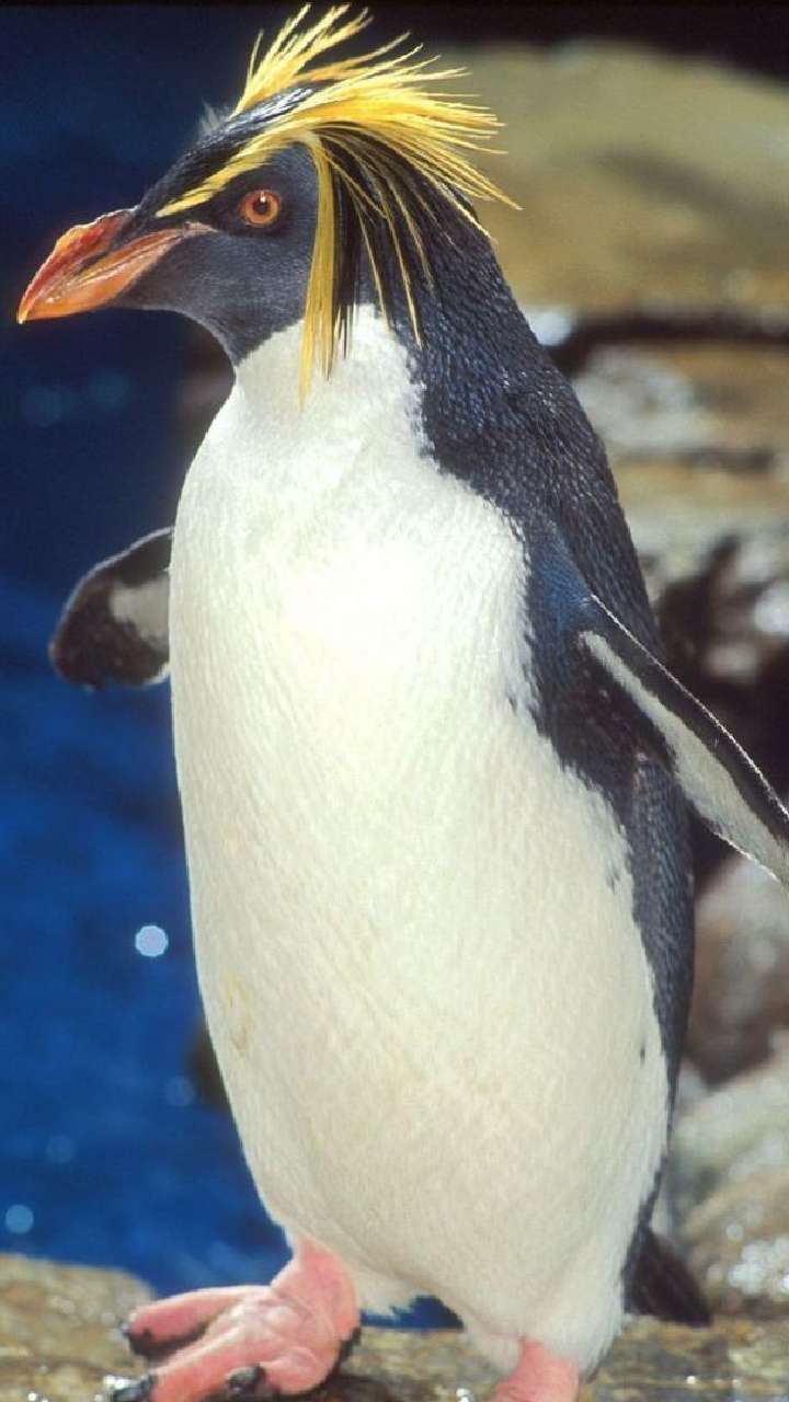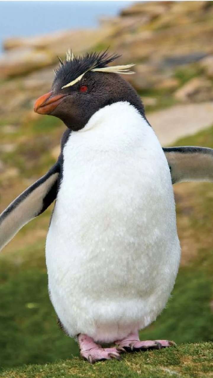 These small penguins are famous for their energetic behaviour and spiky head feathers. Rockhoppers are often seen leaping between rocky shorelines.