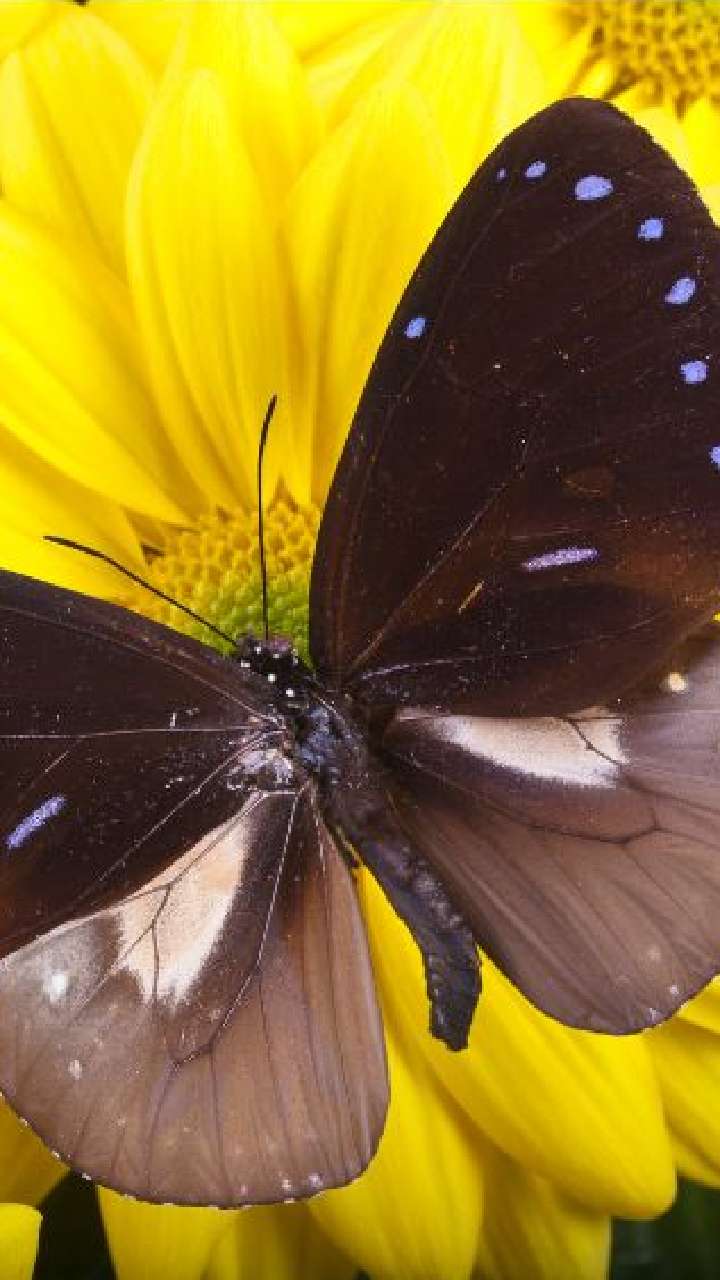 This is a large butterfly with black wings combined with a white spots. Males in these species have smaller wingspan than females.