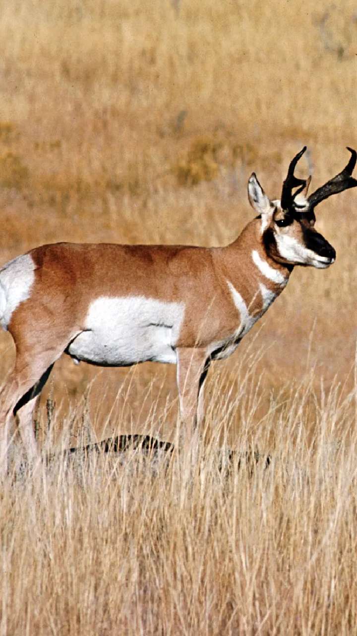 प्रोंगहॉर्न मृग दूसरा तेज़ ज़मीन वाला जानवर है और 98 किमी प्रति घंटे (60 मील प्रति घंटे) की रफ़्तार से शिकारियों को मात दे सकता है।