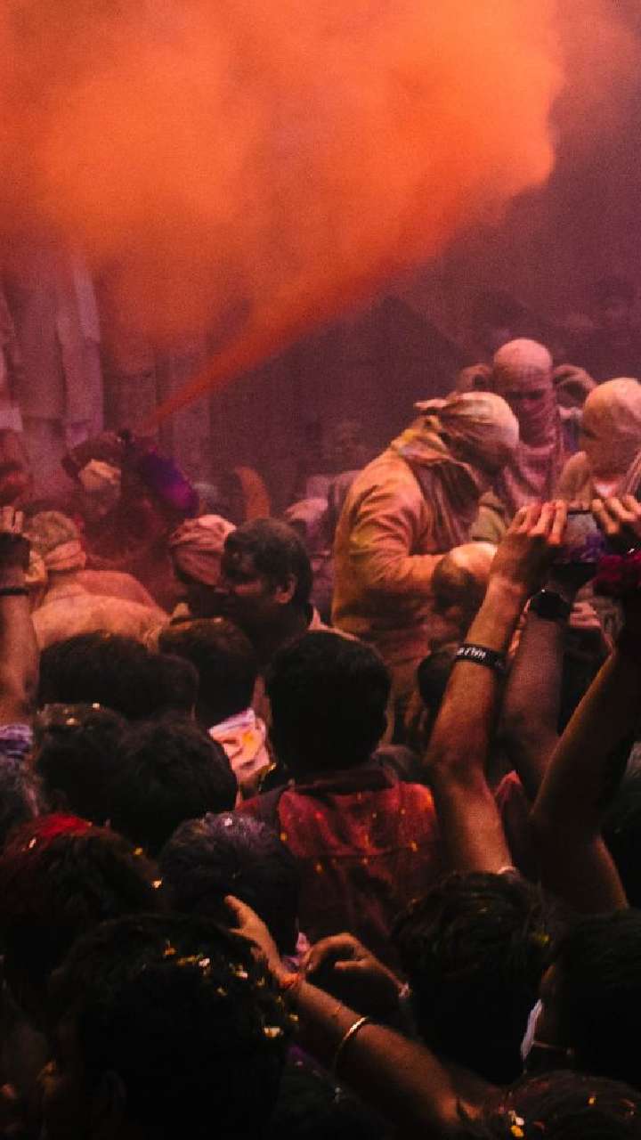 Phoolon Wali Holi at Banke Bihari Temple in Vrindavan sees priests showering flowers and petals while chanting and dancing to create an atmosphere full of life.