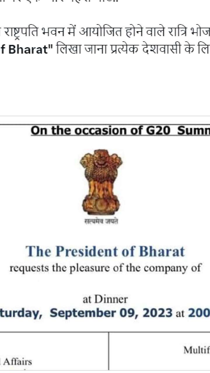 जी 20 सम्मेलन में शामिल होने जा रहे अतिथियों के लिए बनाए गए इन्विटेशन में ‘ द प्रजिडेंट ऑफ भारत’ शब्द का प्रयोग किया गया इससे पहले जब भी कोई राजपत्र सामने आया है उसमें हमेशा द प्रजिडेंट ऑफ इंडिया लिखा होता था।