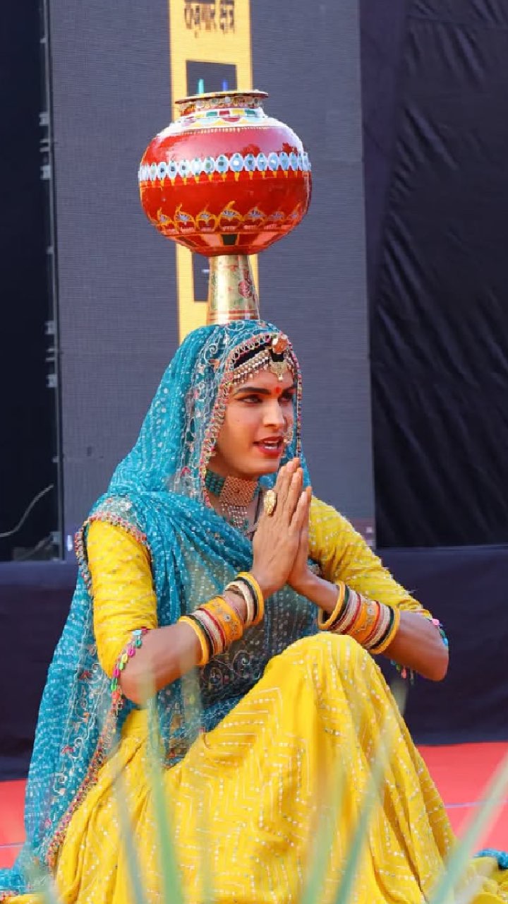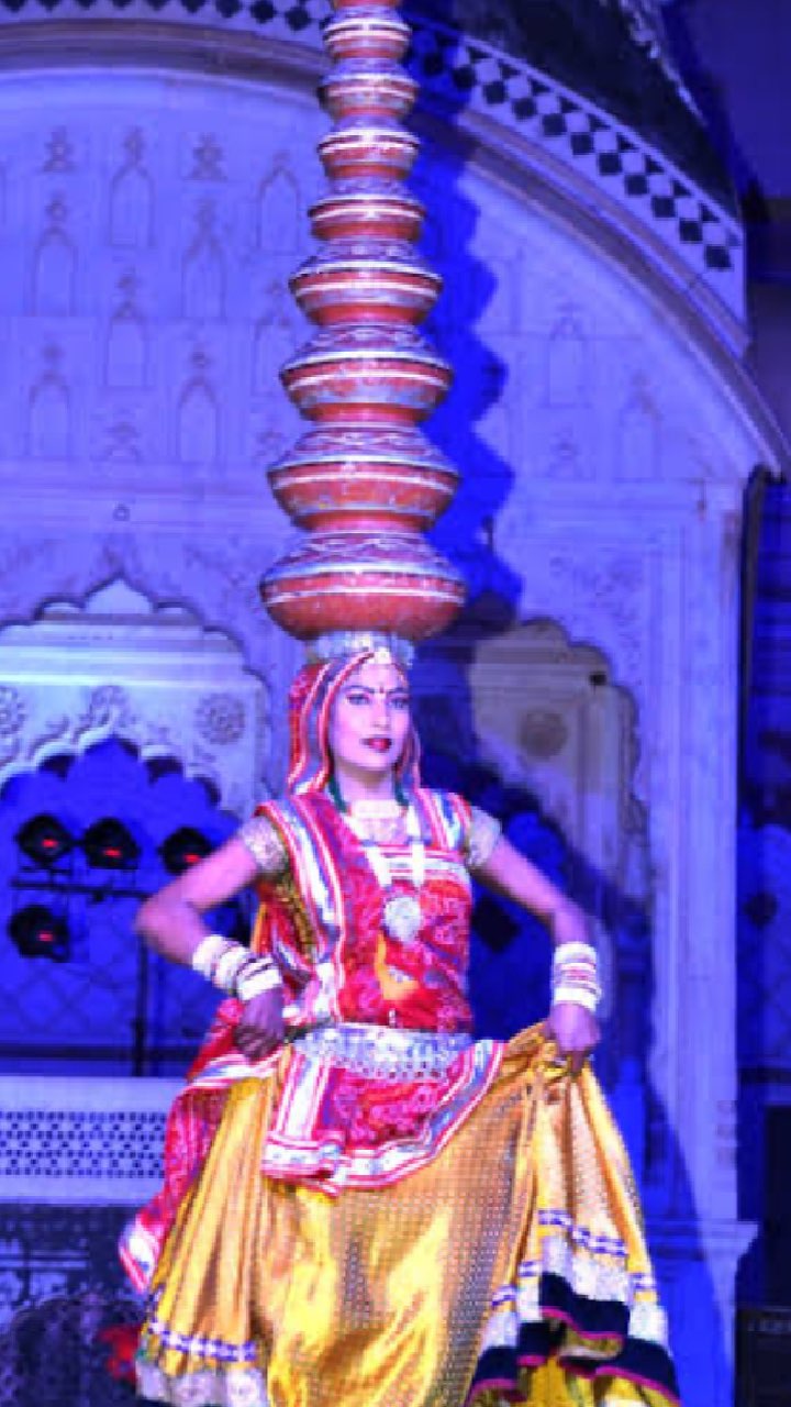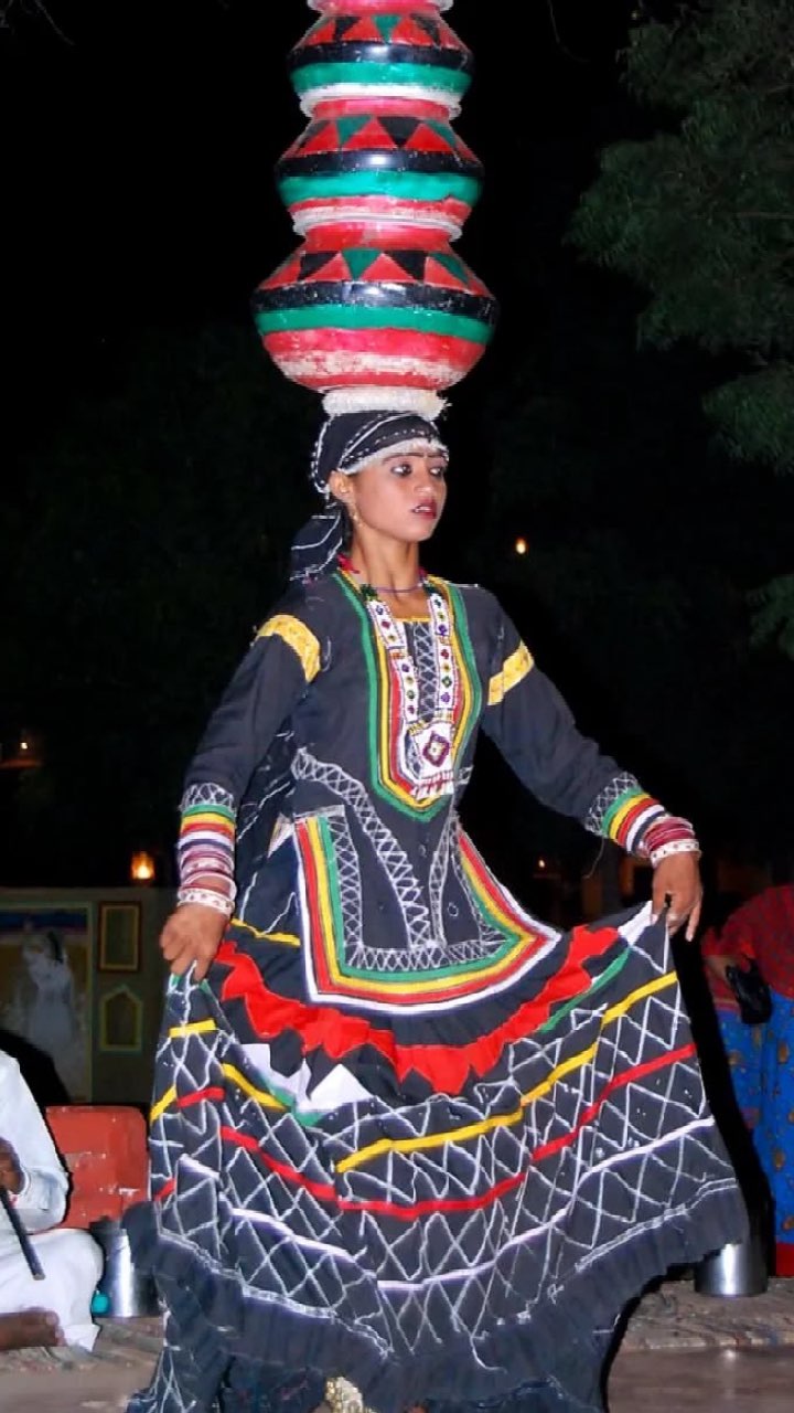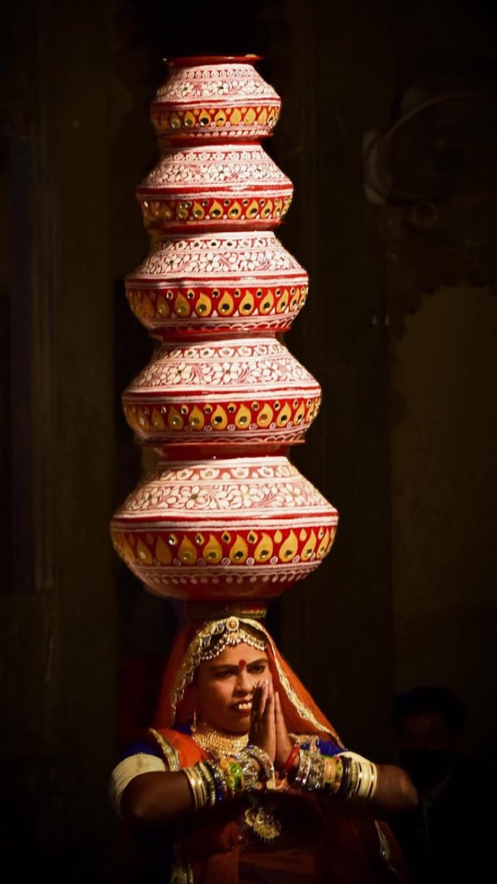 Dancers balance clay pots (matkis) on their heads, demonstrating skill, concentration, and physical strength. This challenging act requires precise balance and coordination, making it a visually captivating performance.