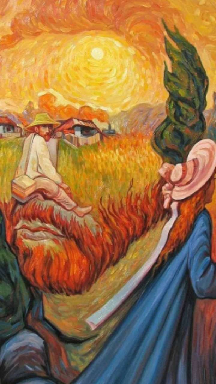 इस तस्वीर में पहले आपको एक दाढ़ी वाला व्यक्ति नजर आ रहा होगा। अब ध्यान उसकी आंखों की तरफ देखेंगे तो वो आंखें नहीं बल्कि दो झोपड़ी है। अब कान की ओर नजर घुमाएं वहां आपको टोपी में एक लड़की नजर आएगी। तस्वीर में एक पहाड़, घास, गांव का दृश्य और सूरज भी है। साथ ही उस व्यक्ति के नाक पर दूसरे बैठे हुए इंसान की फोटो है।