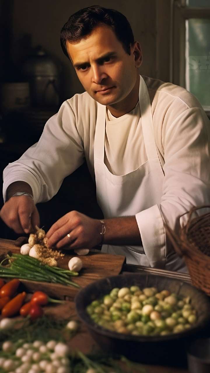 इस फोटो में राहुल गांधी को प्रफेशनल कूक के रूप में दिखागा गया है, जहां वे कुछ सब्जियां काटते हुए जनर आ रहे हैं।