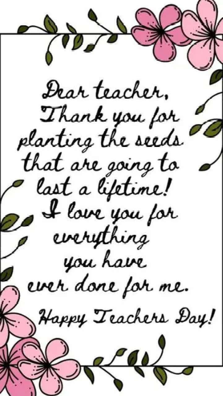 प्रिय शिक्षक, शिक्षण के प्रति आपका समर्पण और जुनून हमें हर दिन प्रेरित करता है। हमारे जीवन में मार्गदर्शक प्रकाश बनने के लिए आपका धन्यवाद। शिक्षक दिवस की शुभकामनाएं!