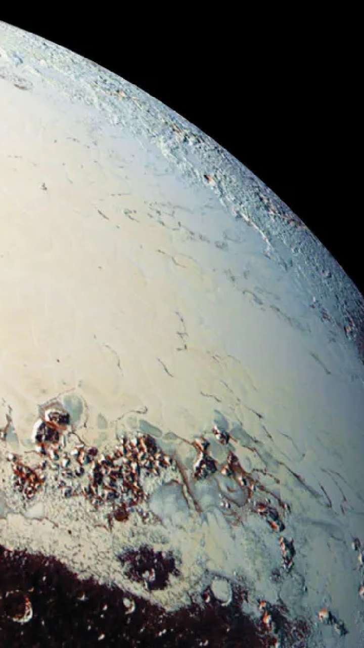 Pluto has a thin atmosphere of nitrogen, methane, and carbon monoxide, which expands when it’s closer to the Sun and freezes back onto the surface when it moves away.