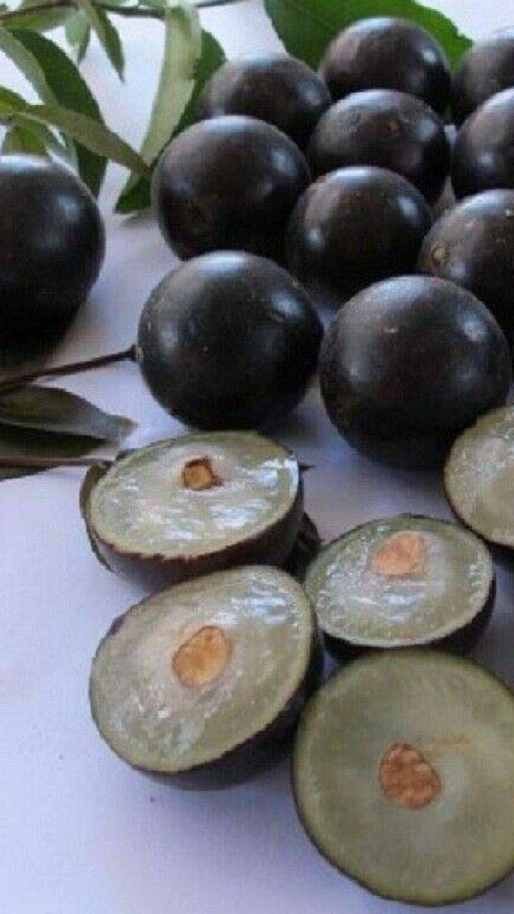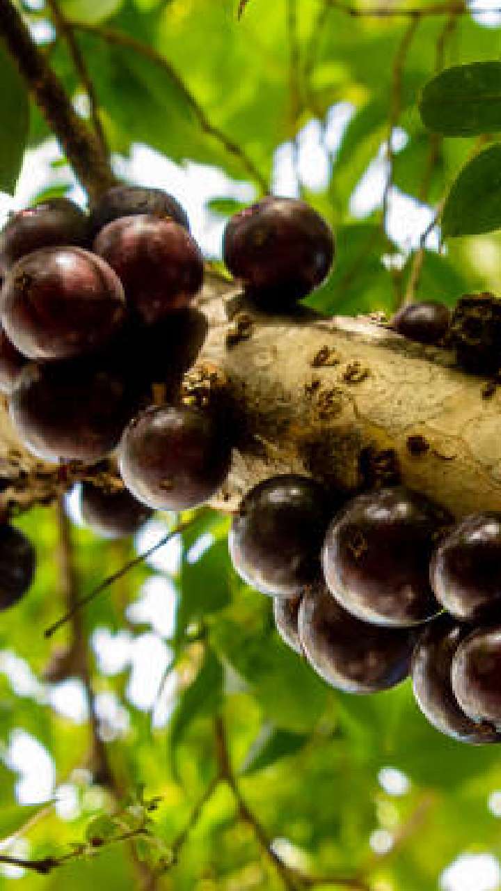 Jabuticaba looks like a grape and grows on the tree’s trunk. It has sweet, tart flesh and is often made into jelly or juice.