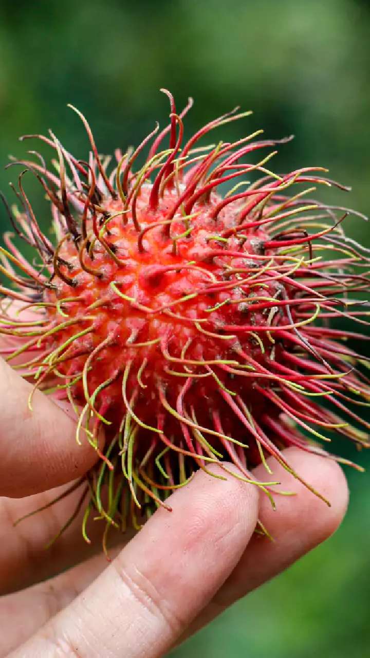 Rambutan has a hairy, red shell and soft, sweet flesh inside. It’s juicy, like a lychee, and is a fun snack in many Asian countries.