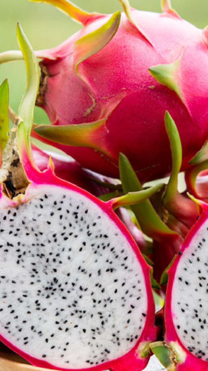 Dragon fruit is bright and colorful, with a soft, mildly sweet flesh. Its taste is similar to kiwi, and it’s full of tiny seeds you can eat.